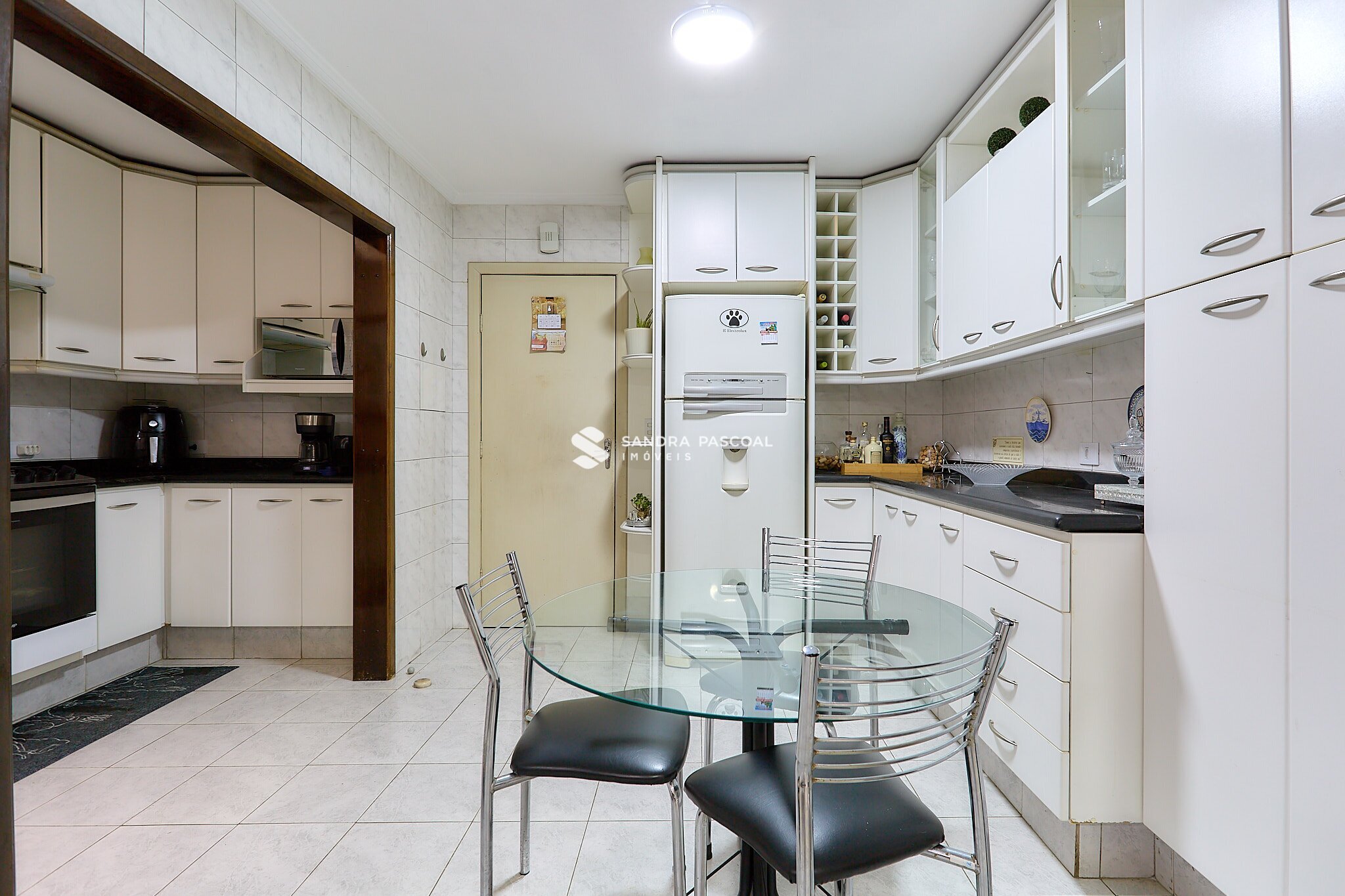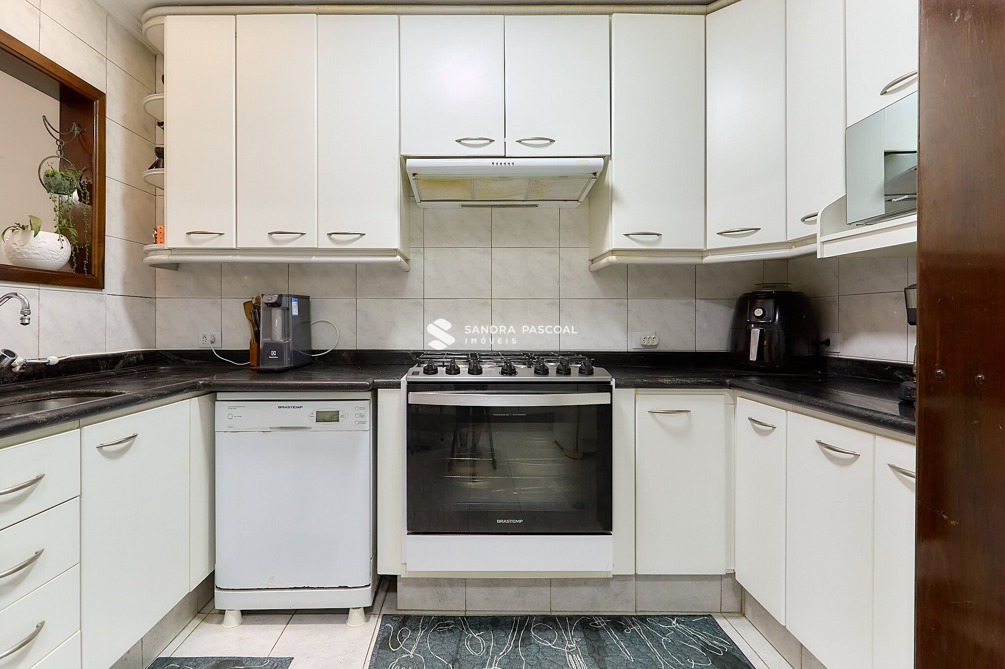 A cozinha conta com armários planejados e água quente e fria, trazendo praticidade para a rotina.