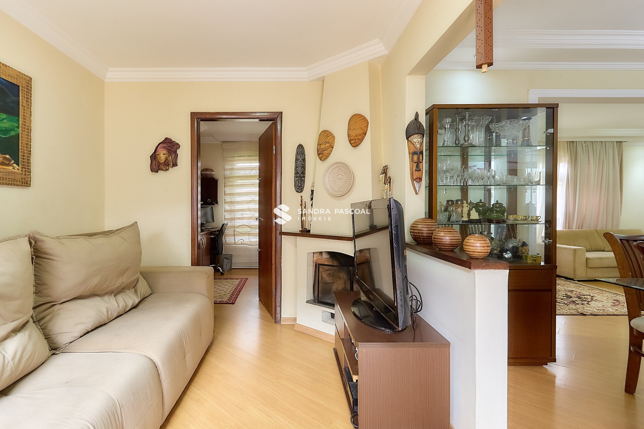 Logo na entrada, a casa conta com uma sala para dois ambientes, integrada a uma sala de jantar ampla e um espaço versátil com lareira que pode ser utilizado como sala de TV ou convivência.
