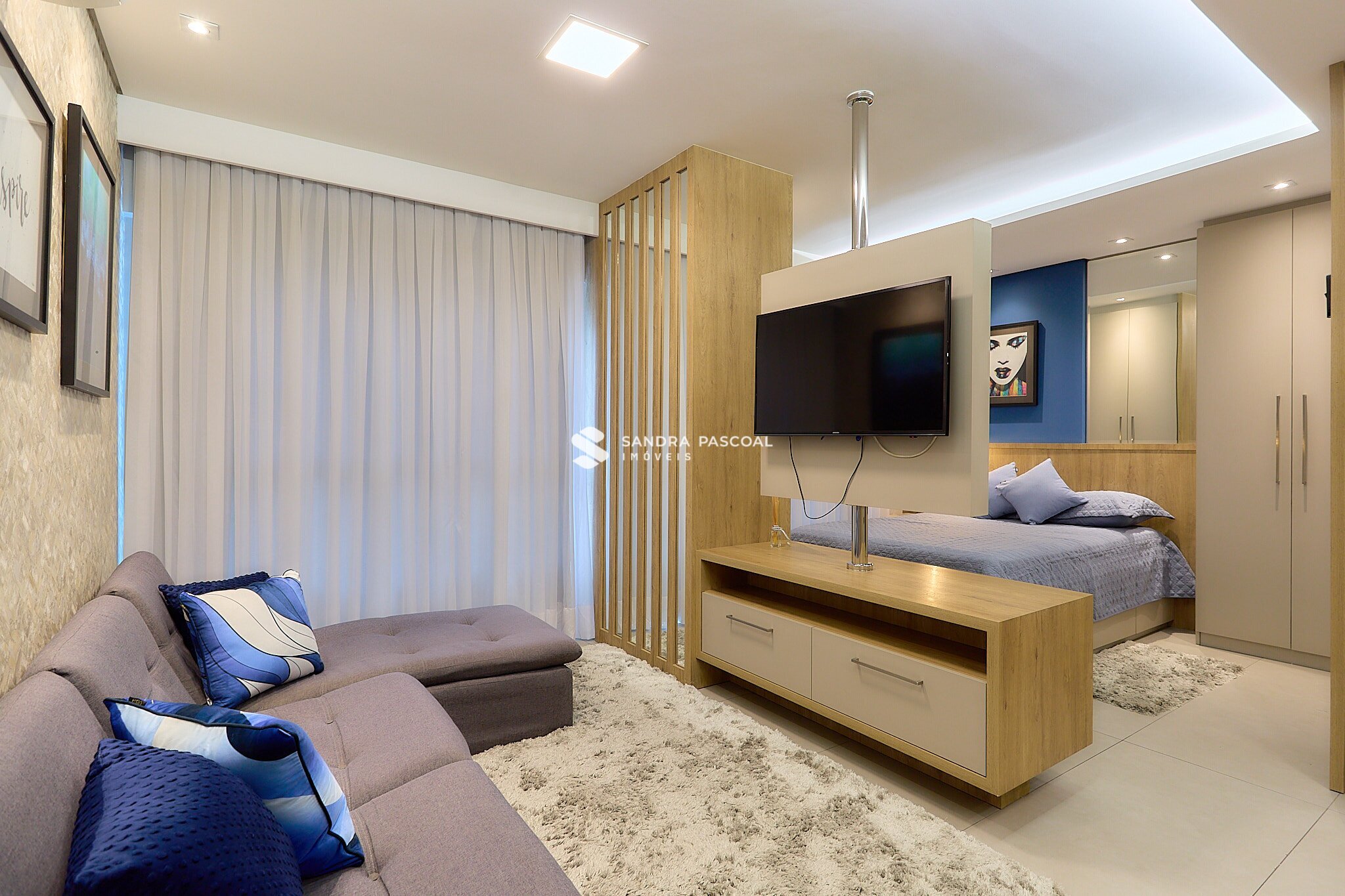 O espaço foi inteligentemente planejado para oferecer integração entre os ambientes, com móveis sob medida, iluminação moderna e uma TV que gira entre a sala e o quarto.