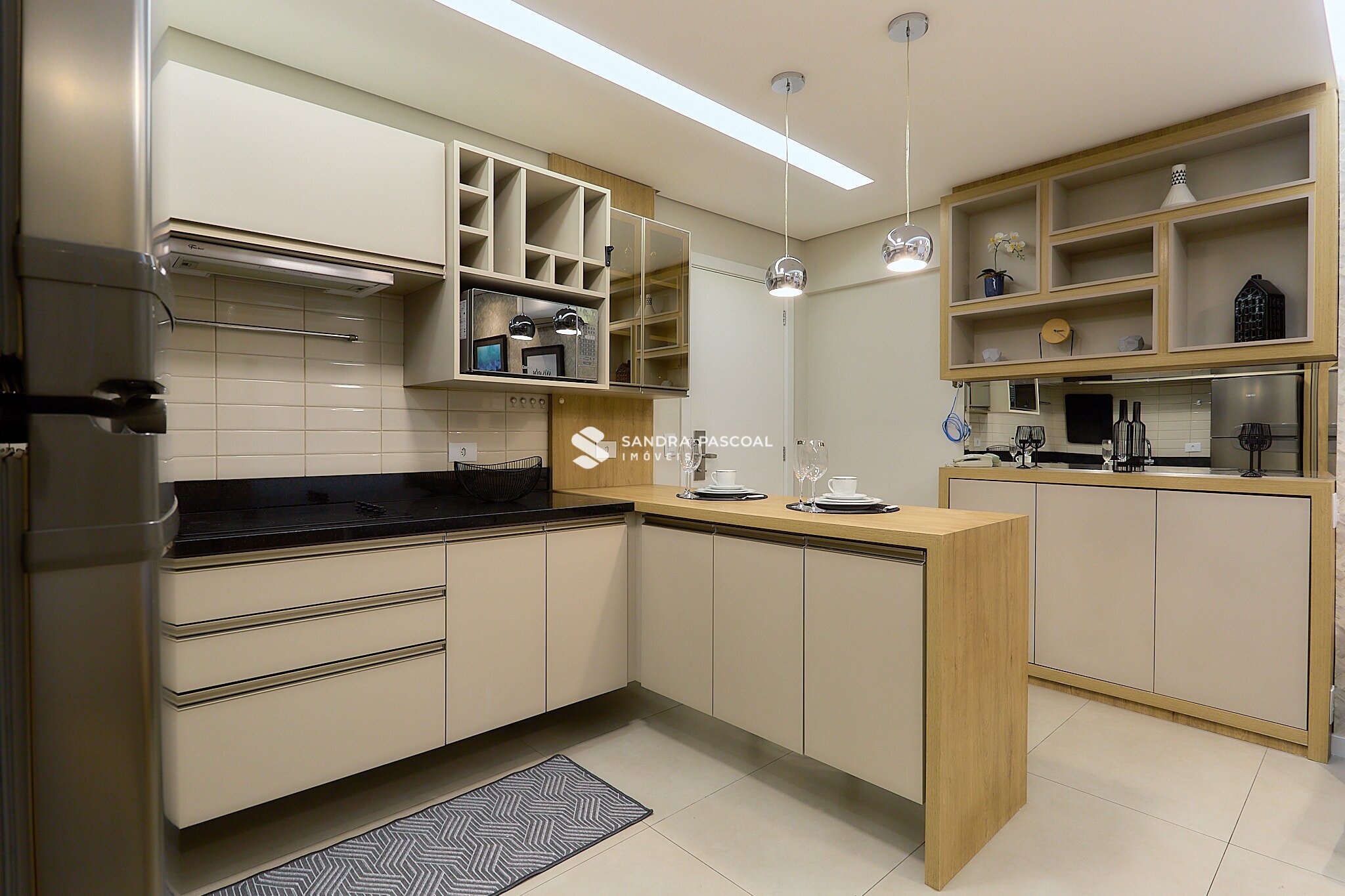 A cozinha é completa, com armários, cooktop, coifa, micro-ondas e geladeira.
